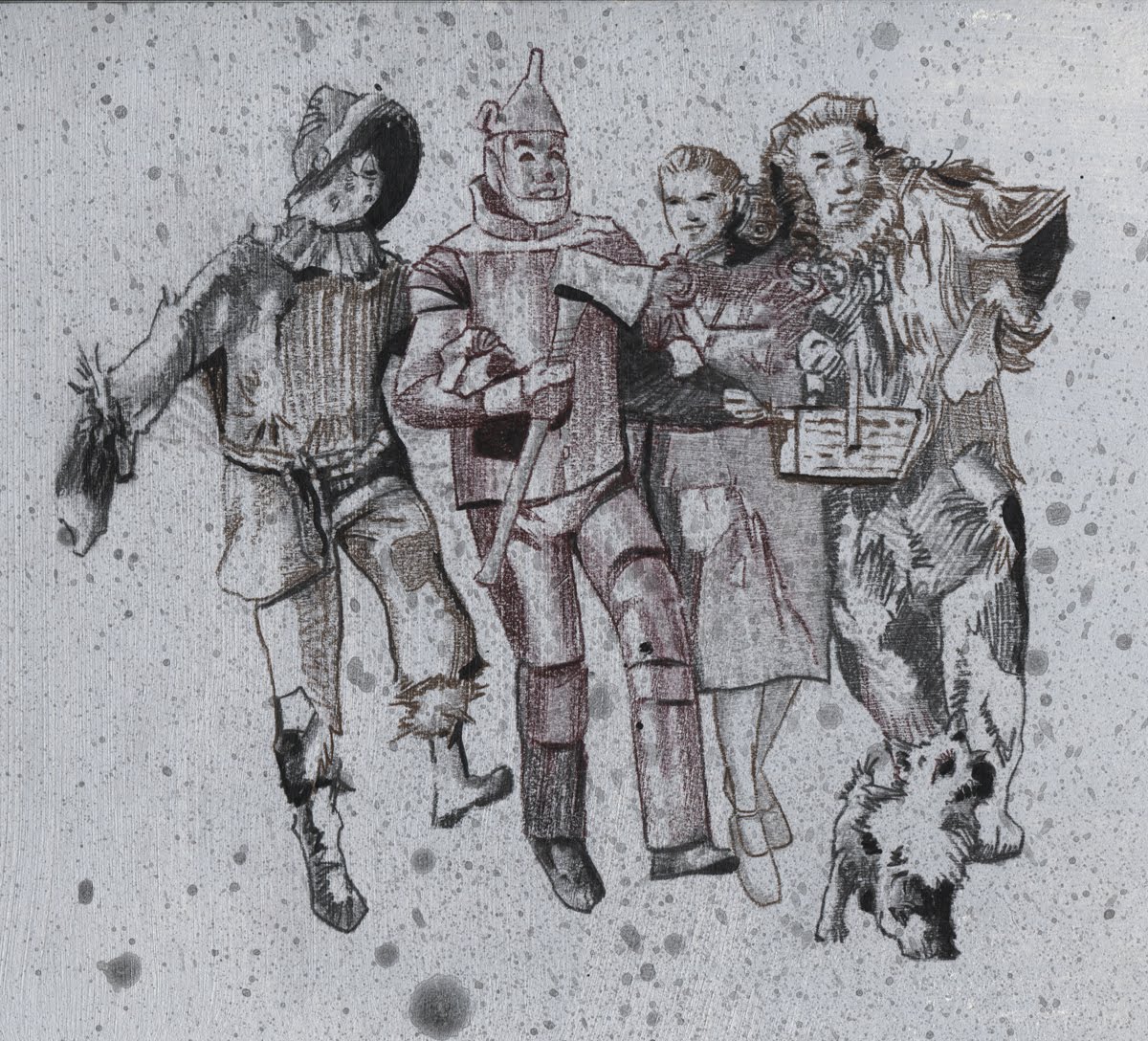 This is the transfer drawing of the troupe of misfits, I created a much lighter prime, and incorporated some colors into the lighter intended shades of the features. If you checked out the older value composition, you can see I changed the Cowardly Lion, I found an image I liked much better...