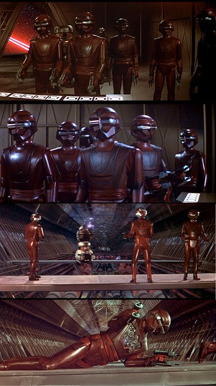And his name is STAR. Now, the movie scenes I managed to capture that showed the full suits, are of the Sentries, but STAR was introduced as a Super Sentry, pretty much exactly the same as the others, but painted black, with a ring of red LED's on his chest plate.