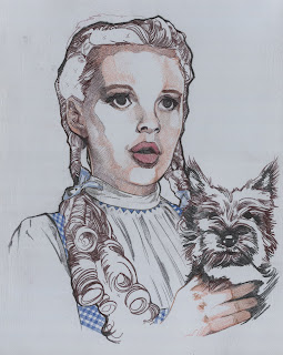 And her little dog, too! I had pretty good success with some of those Leia's, using the dark skin tone colored pencils to build over with the paints, so I did that again with nearly every element of the pic, using the dark black/gray to work in around the eyes and mouth, and for Toto.
